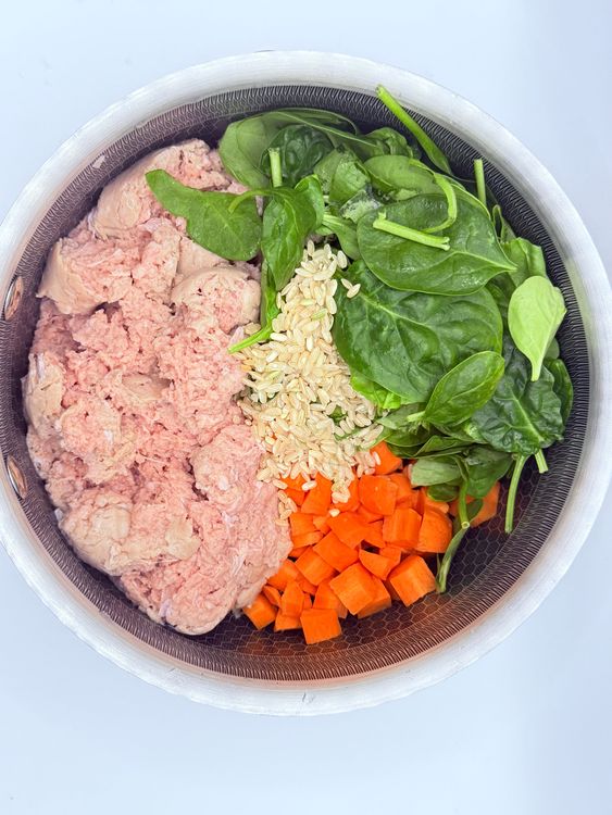 Rinse the rice to remove excess starch. This step is optional but can help improve the texture of the rice. Gather all your ingredients: turkey, rice, water, spinach, carrots, and eggs.